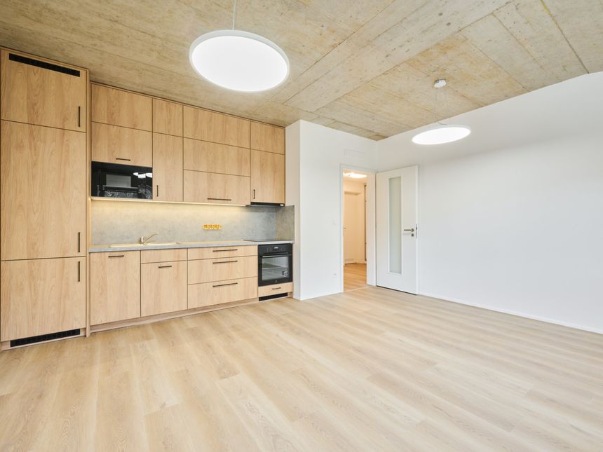Interiér bytu působí velmi čistým a moderním dojmem. Součástí je krásná kuchyňská linka, která přirozeně zapadá do celkového stylu bytu. Velkým benefitem je také rekuperace, díky které je v bytě příjemné klima, a předokenní žaluzie, které zvyšují komfort bydlení i soukromí.